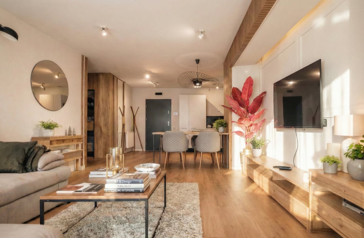 - Free parking on premises. - 85 m2, with AC in each room. - Spacious 2-bedroom for 4 guests. - Living room with an extensible sofa for an additional 2 guests. - 1.5 bathrooms - Modern amenities including a TV, desk, coffee maker and more. - Balcony with a charming view of the city. - Ideal location in the City Center, close to attractions such as Central Park, Union Square, Old Town, The Botanical Garden, museums, restaurants, pubs, Babes-Bolyai University and many more.