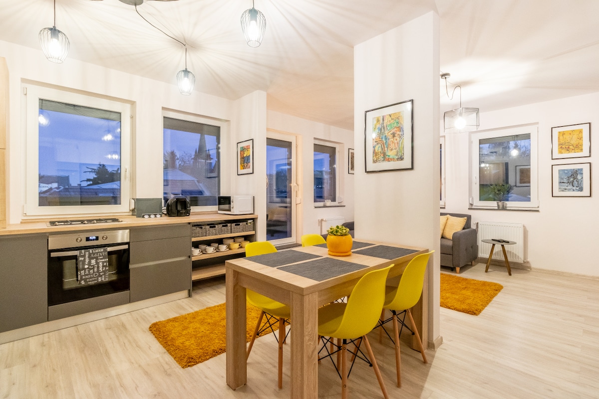 Welcome to our brand new one-bedroom apartment in Cluj Napoca, just 2 km from the city center! Perfect for solo travelers, couples, or small groups, this stylish space features a comfy double bed, an expandable couch, a fully equipped kitchen, Smart TV with cable& Netflix, and a beautifully furnished bathroom. Come enjoy a cup of coffee on the house while you take in the peaceful surroundings from the terrace. Private parking and self-check-in are included. We look forward to hosting you!