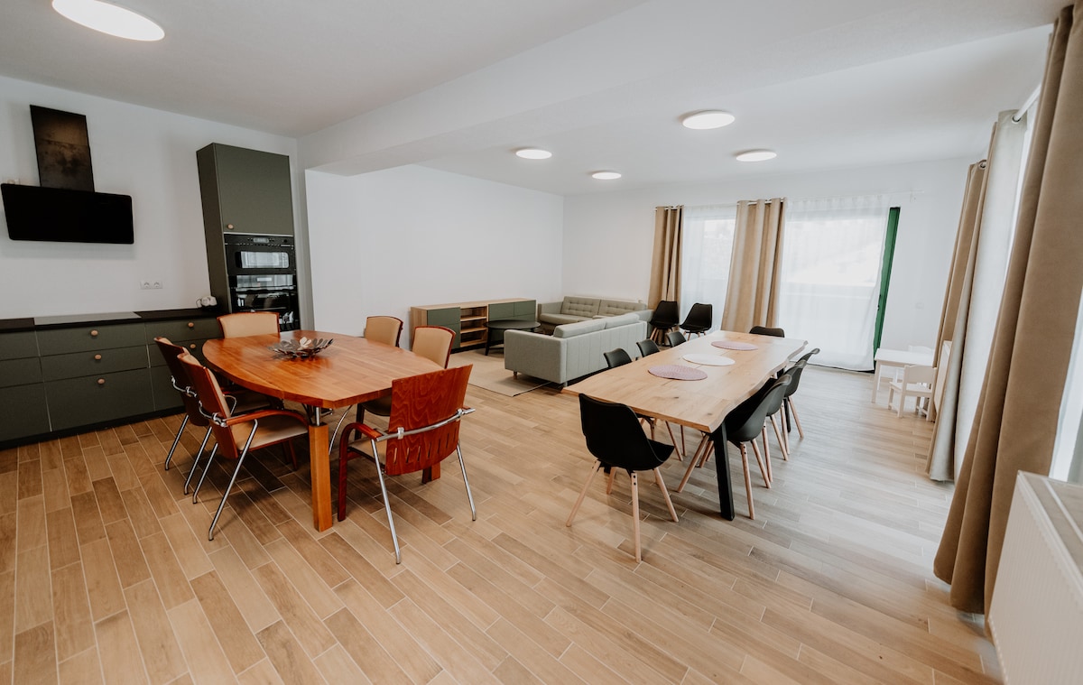 Această locuință șic îți oferă tot ceea ce ai nevoie pentru o ședere de lux. Pensiunea se afla in mijlocul naturii,într-o zonă cu aer curat,pădure și mult verde. Îți punem la dispoziție toate facilitățile necesare pentru un sejur reușit: -mic dejun inclus -piscina exterioara -jacuzzi -loc de joaca pentru copii -centru SPA -bucatarie complet utilată -loc de barbeque Toate camerele au baie privată,tv cu ecran plat, wifi gratuit,birou și dulap. Oaspeții au la dispoziție un bar,lounge comun,parcare
