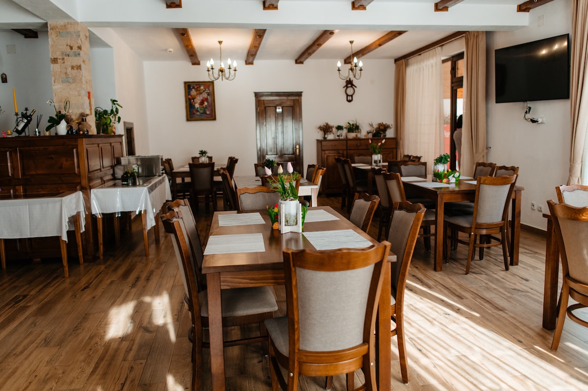 Un spațiu elegant cu acces la restaurant și terasă. Ideal pentru ieșirile din rutina zilnică și pentru cei care doresc să viziteze meleagurile de poveste ale Transilvaniei. Parcarea este dotata cu statie pentru incarcare autoturisme electrice. Meniul restaurantului contine: - preparate traditionale, ciorbe. - mancaruri din bucatarie internațională - pizza pe vatra, paste, burgeri - mic-dejun variat