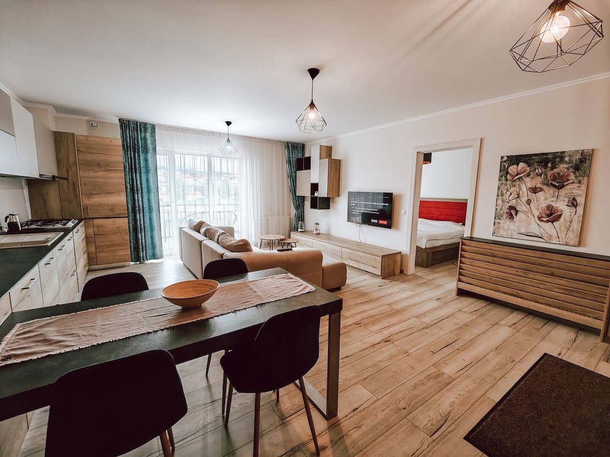 Welcome to our comfortable apartment in Cluj-Napoca, the heart of Transylvania! Being located close to the city center in an 6 floore building, you will benefit of an amazing panoramic view especially at sunset. The generous studio is designed with all the necessary facilities for a comfortable stay, you will find here a TV for moments of relaxation, a kitchen equipped with a refrigerator, stove, dishwasher as well as a dining area for 4 people. Thank you for choosing us as your hosts!