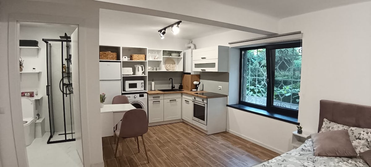Wake up to the sound of the river flowing just outside your window. This cozy studio offers a calm escape in the heart of Cluj, perfectly located between close to Central Park, Parcul Feroviarilor, Cinema FP. Relax on the river-facing windowsill with your morning coffee, or unwind in the private garden after a day of exploring. Inside, you’ll find a queen-size hardwood bed with a memory foam mattress for a great night’s sleep, fast WiFi, a smart TV — ideal for both relaxation and remote working