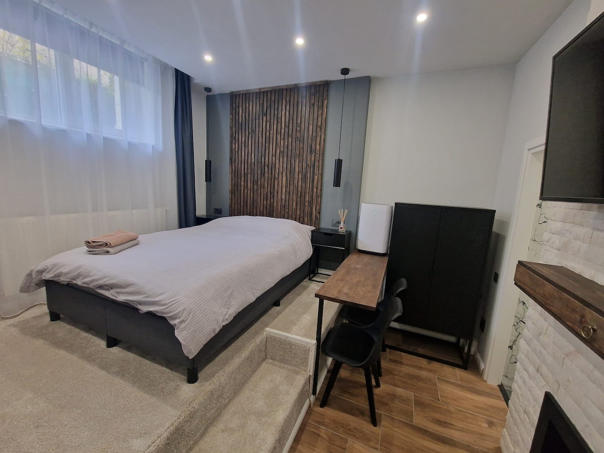 Located on a pedestrian side of the Unirii Sqare right in the heart of the historic center, with most attractions, restaurants and caffee’s at your doorstep. Private entrance, thoughtfully designed interior with personal touches, exposed brick walls and artworks reflecting the host’s style and personality. Large couch, queen size double bed with flat mattress, soft linens. Private bathroom with walk-in shower. Kitchenette with essential devices such as a microwave, a hot plate, and frige.