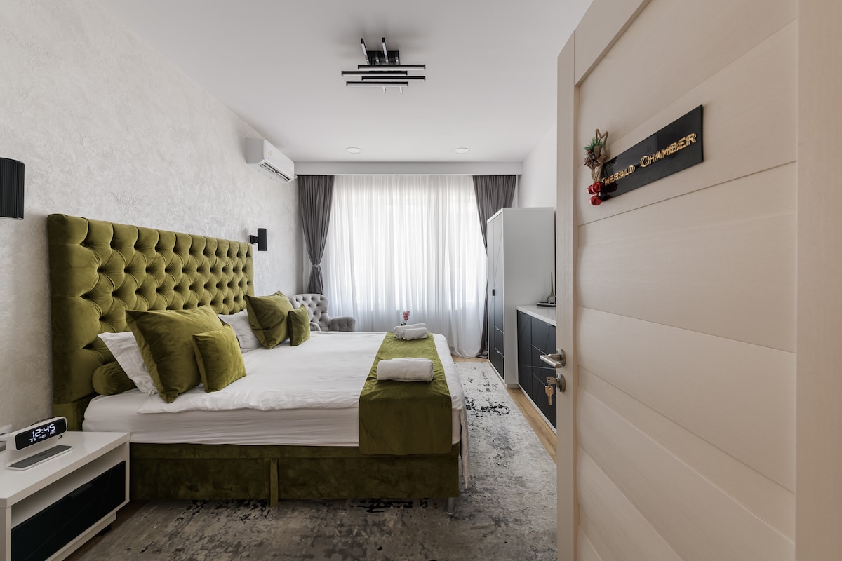 This 50 sqm apartment blends refined modern design with elegant details and a soothing atmosphere. The Royal Master Bedroom features a luxurious king-size bed (200x200 cm), a freestanding bathtub, and a rotating TV viewable from both the bed and the bath — perfect for intimate moments of relaxation. Soft lighting, fine textures, and a spacious wardrobe complete the sophisticated charm of this romantic hideaway, where comfort meets elegance in every detail, creating an unforgettable stay.