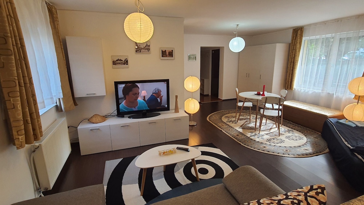 Experience the comfort and luxury in our cozy 1-bedroom apartment, designed to accommodate up to 3 people. Tucked away in a serene neighborhood, this hidden gem offers an inviting ambiance and boasts a luxurious jacuzzi and private garden. The highlight of this apartment is undoubtedly the private jacuzzi, where you can immerse yourself in a blissful oasis of tranquility. Conveniently located right near a bus 42 station, this cozy apartment provides easy access to the city center.