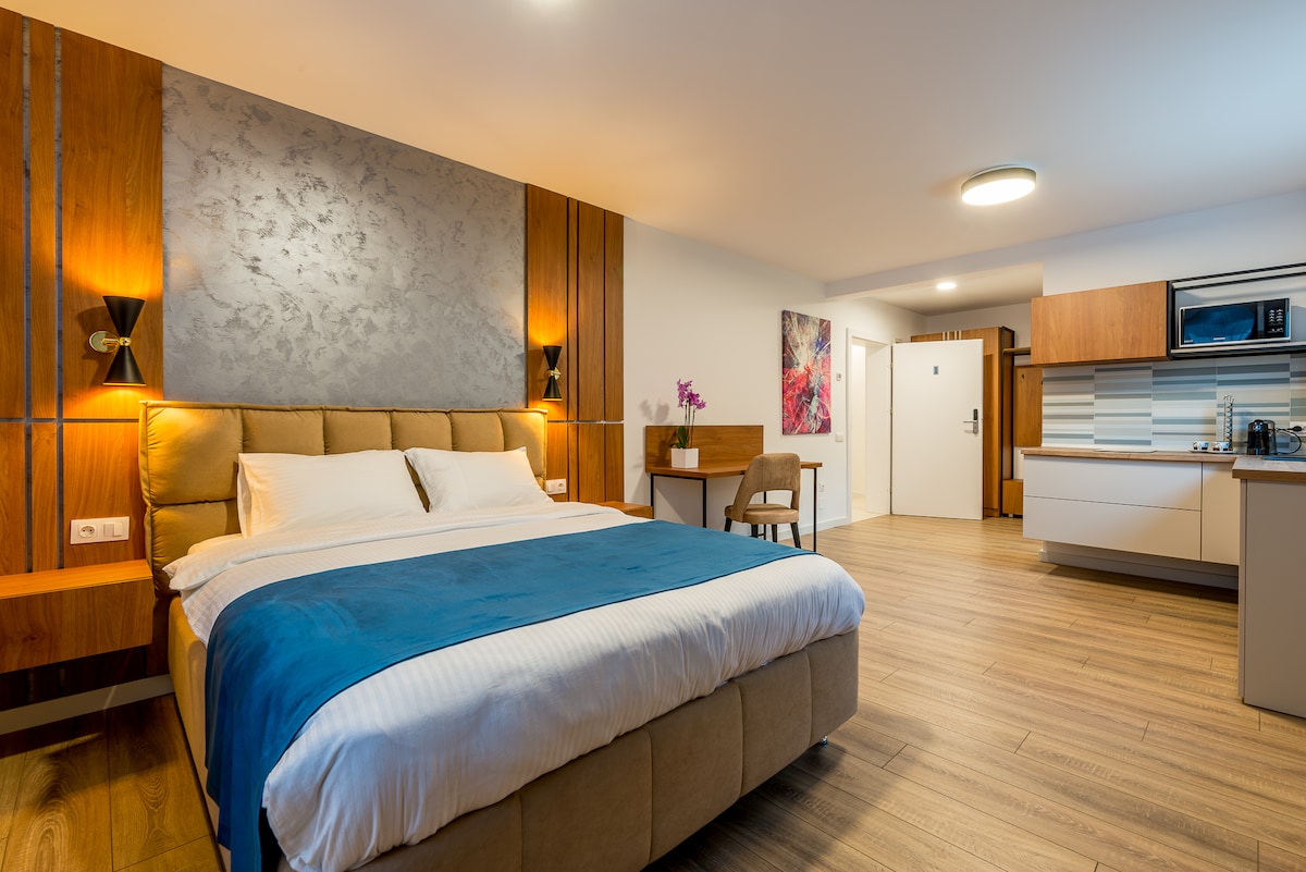 The Brown Studio is a newly redesigned apartment right in the heart of Cluj-Napoca, with one room with a kingsized bed, a independent kitchen and bathroom. Amenities - Kitchen is fully equipped - LCD TV ,WIFI -The room has a big comfortable bed (160x200 cm) and a 80 cm flatscreen TV and a wardrobe. The kitchen has a space area designed for workspace/dining and 2 chairs.