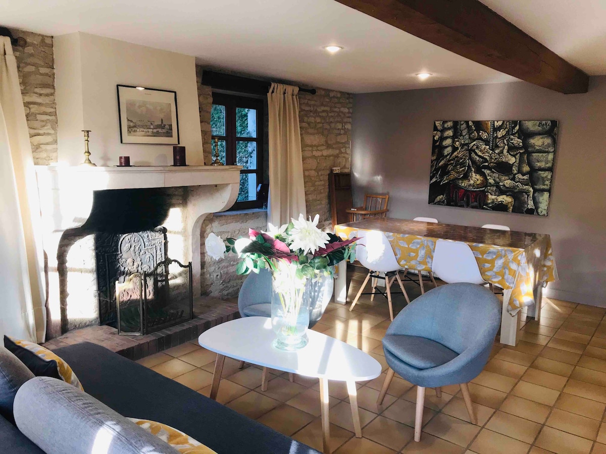 Maison vigneronne, rénovée en 2021, au coeur du village viticole de Givry, située sur la route des vins de la Côte Chalonnaise. Gîte 80 m2 avec cour intérieure partagée où sont mis à votre disposition salon de jardin, accès au barbecue, table de ping-pong, ainsi qu'à la piscine chauffée (mai à octobre selon météo) Capacité d'accueil de 4 personnes. Cuisine équipée, salon TV et 2 chambres dont 1 avec sdb. Toutes commodités et activités (vélo, dégustation, ...) à proximité