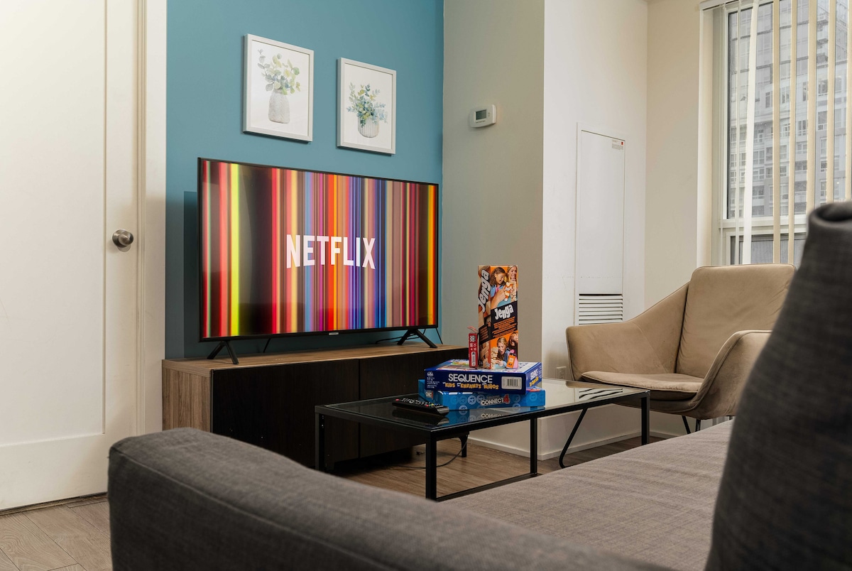 Imagine waking up to the breathtaking sight of the CN Tower piercing the skyline, its reflection dancing on Lake Ontario. After a day exploring Toronto's vibrant streets and visiting landmarks like the Rogers Centre, the Scotiabank Centre & the magical Ripley's Aquarium, unwind in the living area with panoramic views, or stroll to nearby restaurants and nightlife. Equipped with basic cooking and dining utensils, towels, linens, and bath essentials. Catch your favourite show on the smart TV.
