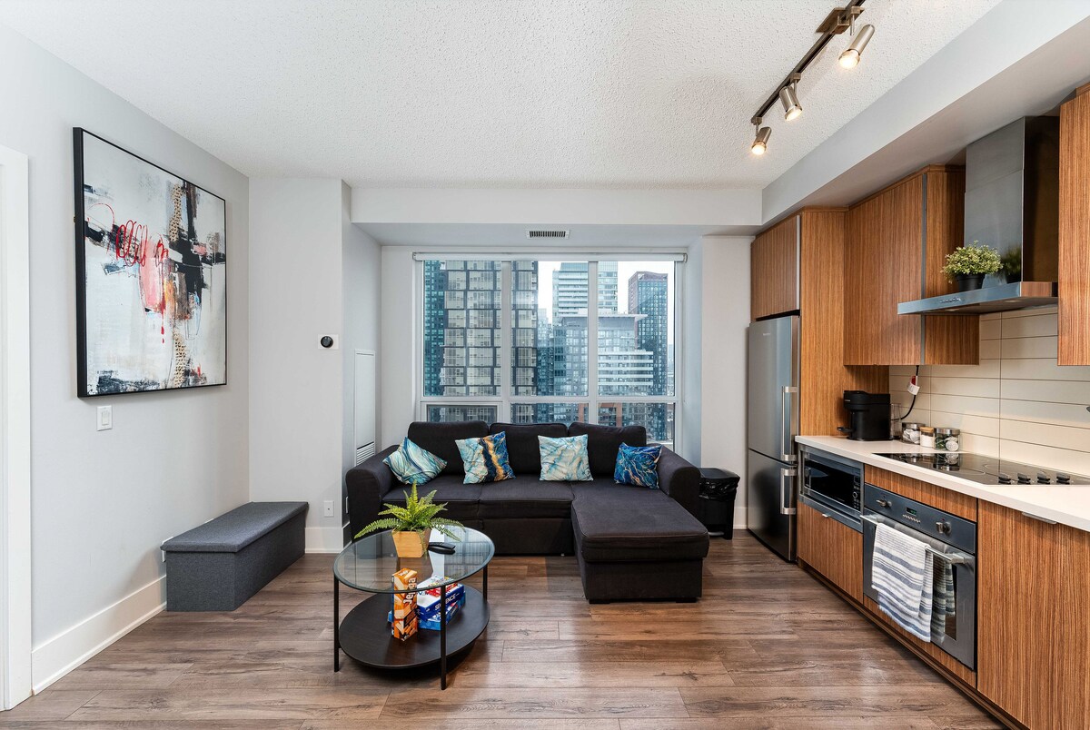 Welcome to your cozy urban retreat in the heart of Toronto! This modern and stylish 2-bedroom condo is situated in the vibrant entertainment district, offering you the perfect blend of comfort, convenience, and contemporary living. The living room is tastefully furnished with a comfortable sofa, perfect for unwinding after a day of exploring the city. Enjoy your favourite shows or movies on the 65" smart flat-screen TV equipped with streaming apps for your convenience.