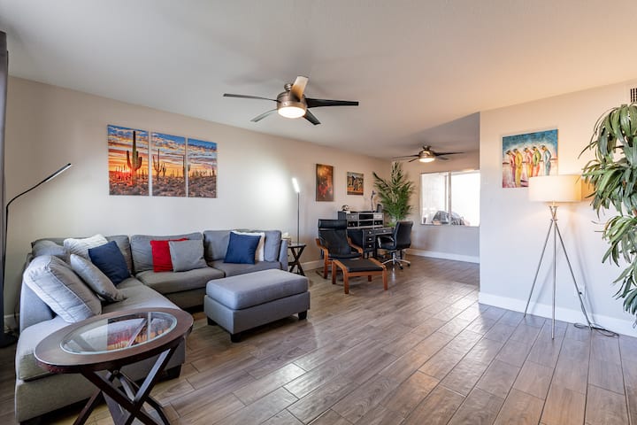 前往机场非常方便,但仍然非常温馨祥和。 这家爱彼迎房源看起来和照片中一模一样,从预订到退房的一切都很方便,和预期的一样。 下次还会再来,有更多时间享用游泳池和可爱的小狗。