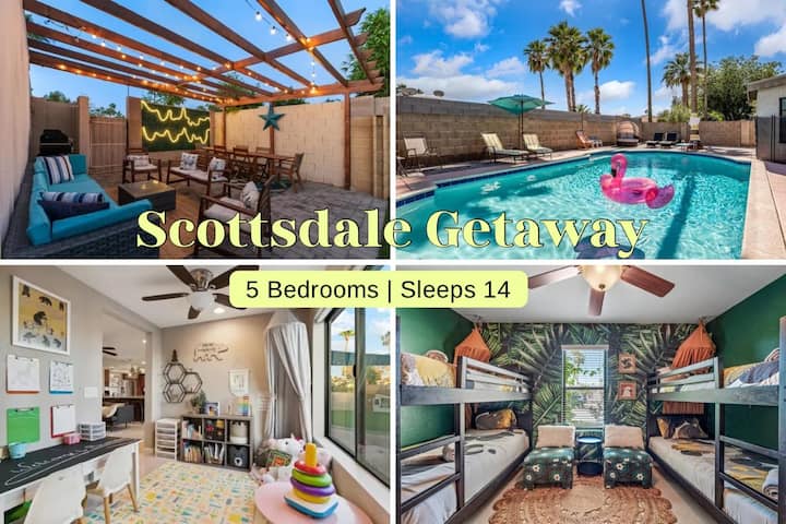 这里是孙辈的天堂! 我们有6个3至12岁的小孩,当他们看到游戏室和攀岩墙时,他们都尖叫起来。 此房源的泳池周围有安全围栏,这是我们家必备的。 房源室内外还有很多聚会空间。 如果您带着孩子一起入住,这里就是您的好去处!