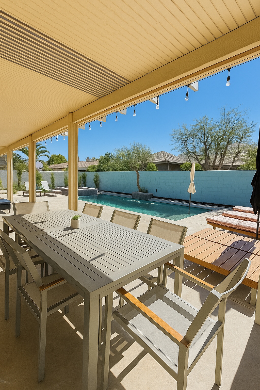 Welcome to your private desert oasis! Unwind and soak up the sun in our one-of-a-kind backyard retreat,featuring a spectacular private LAZY RIVER POOL A lazy river, crystal-clear Caribbean-style for endless floating fun, a “Tornado” waterslide, and a rainfall bridge. Enjoy in-pool loungers for ultimate relaxation, pool basketball, outdoor Bluetooth speakers, a BBQ grill, elegant dining and lounge areas,and a soothing hot tub for starry desert nights Your unforgettable desert getaway starts here
