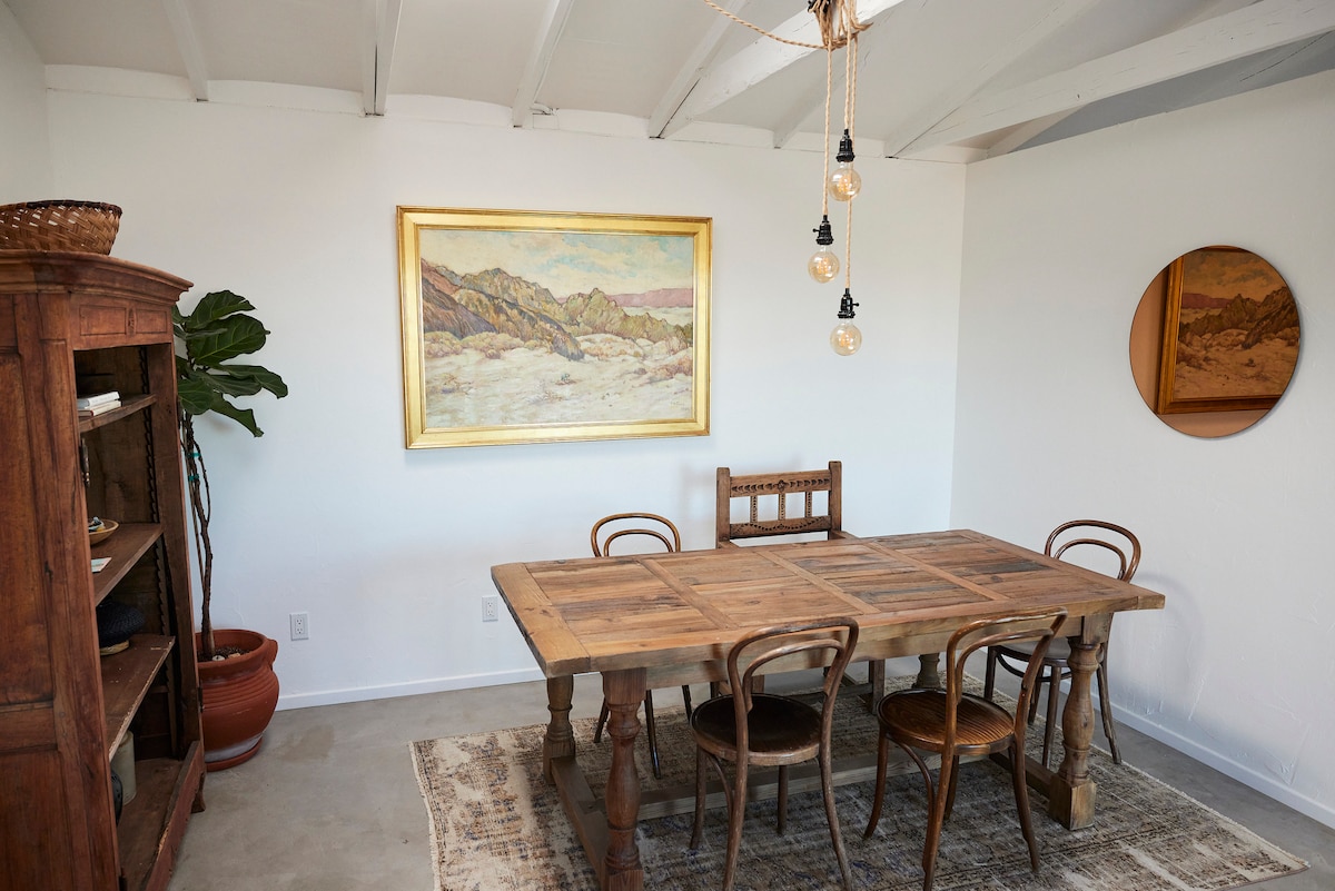 Welcome to a sanctuary for reflection, creativity, and stillness. This thoughtfully curated hideaway features a large soaking tub and access to the stunning shared pool and hot tub at High Desert Protocol. Set two miles up a quiet dirt road, this ever-evolving 6-acre desert compound borders public land—offering a rare sense of vastness, privacy, and possibility, perfect for seclusion and connection. (Interested in a full buyout? The entire property sleeps 16 guests. Inquire for details.)
