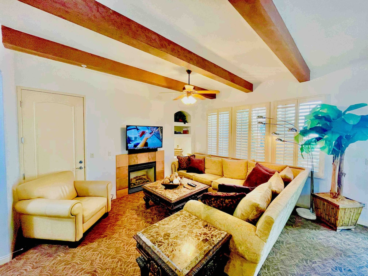 COVID safe La Quinta Condo with special rates! Take advantage of the work-from-home-away-from-home Condo. This newly decorated top floor condo has 3 huge bedrooms and 3 bathrooms. Each guest room features crisp white hotel sheets, and a fluffy alternative down comforter. The King bedroom and living room each feature a smart TV and fireplace. There is a huge balcony for you to enjoy the views of the picturesque Santa Rosa Mountains while you lounge & enjoy meals prepared on the outdoor grill.