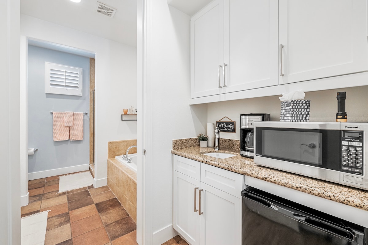 Kick back & relax with your pup at "One Chic Desert Retreat"! This single story STUDIO is located right next to our favorite satellite pool at beautiful Legacy Villas, the ultimate romantic spot. King canopy bed, TV with Netflix, cable, WIFI, Fireplace, Table for 2, Patio to enjoy breakfast & dinner al fresco while soaking in the amazing views. Kitchenette with all the basics & so much more! Legacy Villas Resort offers 12 pools & hot tubs, a gym, fountains, a walking trail & stunning views!
