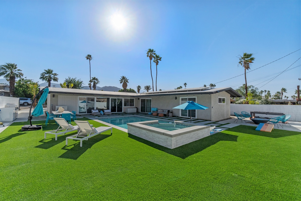 The Palmetto House - A Luxury + Mid-Century Oasis with a private resort-like pool with cabana, fire-pit, hot tub & amazing views of the San Jacinto mountains located about 2 miles from Downtown Palm Springs. This mid-century modern home was designed by legendary Architect James Cioffi and offers a spacious layout and seamless flow to the pool area. High ceilings and windows let tons of natural light flow in creating an oasis both inside and outside.