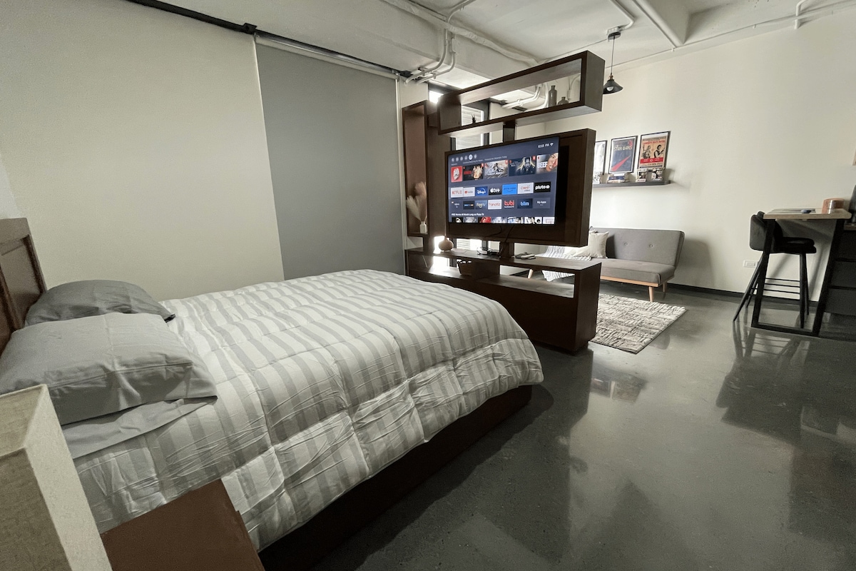 Espacioso, moderno y equipado loft ubicado en el centro de Monterrey. 🍽️ ☕️ - Cocina equipada con sartenes, ollas, air fryer, cafetera (café americano, descafeinado y te), utensilios de cocina, etc. 🛏️ - Cama Queen size, sabanas y ropa de cama limpias 🛋️ - Cómodo Sofa Cama ❄️ Mini Split con AC y Calefacción 📺 - TV de 50”, Netflix, Prime, HBO Max 🛁 - Baño completo, toallas limpias, secadora y artículos de aseo personal 👨💻 - Escritorio + Alexa 🏪 - OXXO 🏋️♂️ Multiples Amenidades