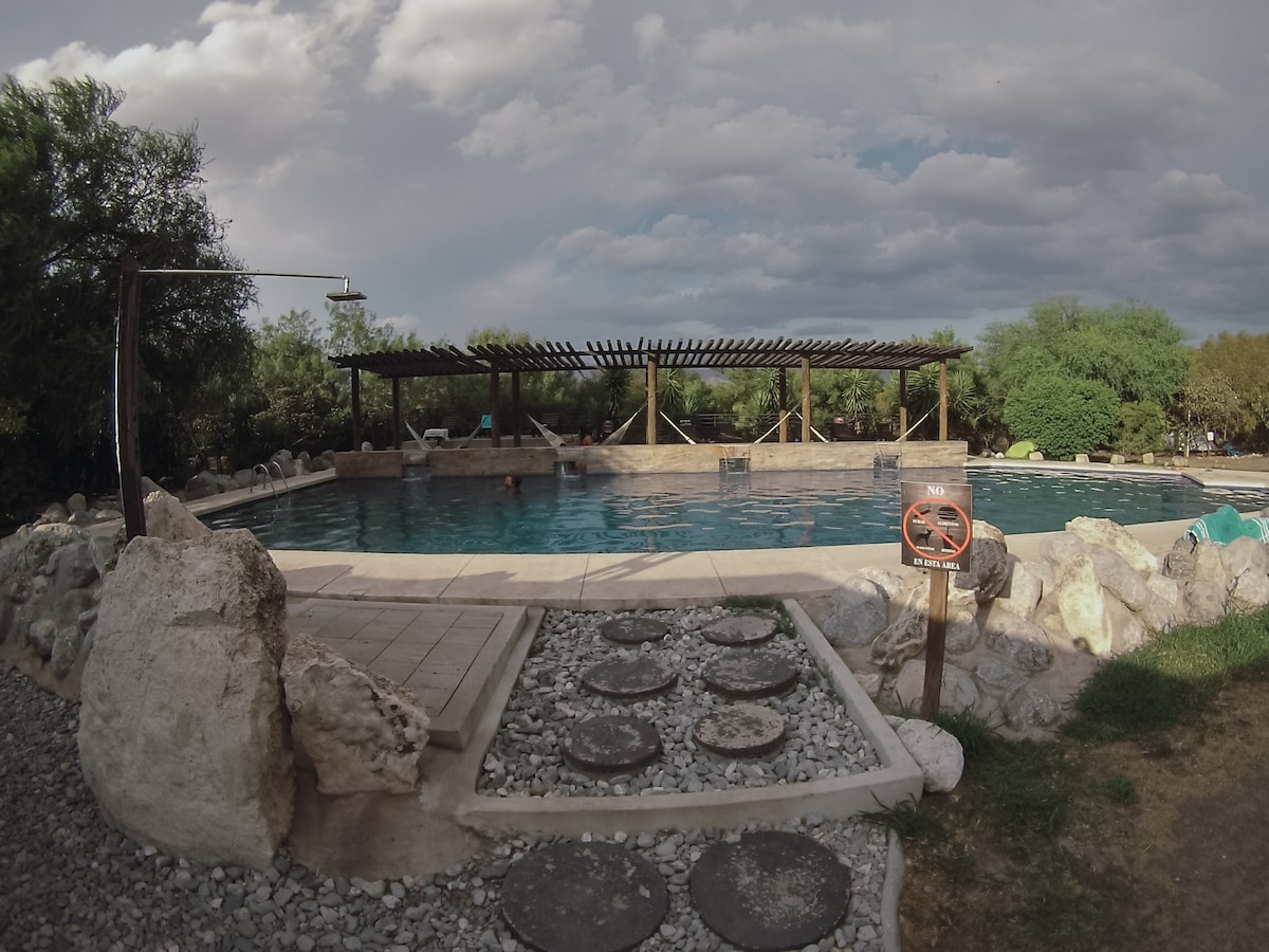 This lodging on La Posada en el Potrero Chico has the best views of the mountain. By far the best place to relax, meet people and practice climbing. The House has two bedrooms with two double beds each, full kitchen with utensils and a private bathroom. Also our place has an outside pool, onsite restaurant "La Tradición", temazcal, grills, fire pit and a climbing school. Climbing area is about a ten-minute walk up the road from La Posada.