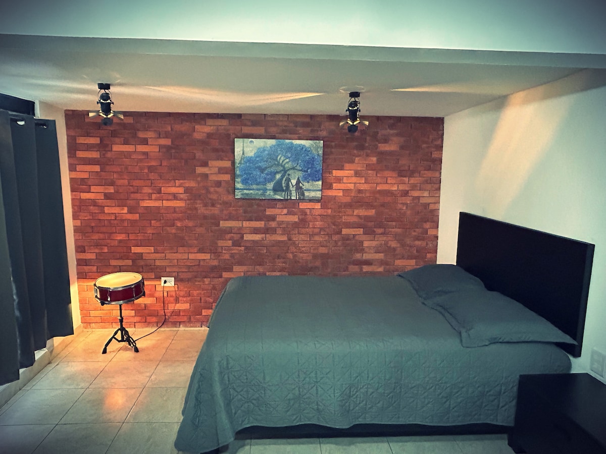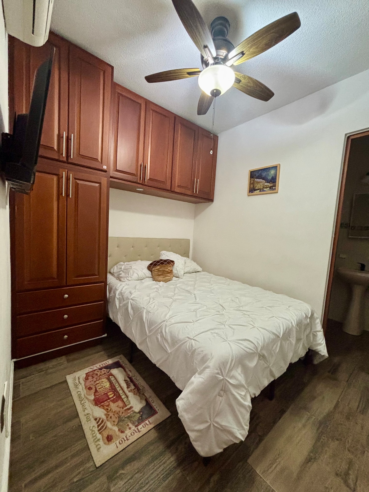 Departamento entero, en recámara tiene cama King Size y 2 sofá cama, aire acondicionado frio/calor, TV, closet y cajoneras. Además, tiene exclusivamente para ti: sala con 2 sofá cama, baño completo, barra comedor, cocina (con refri, estufa, micro ondas, horno, cafetera, nutribullet, sartenes, platos, etc.) Wi-fi rápido de 80MB, TV en sala.