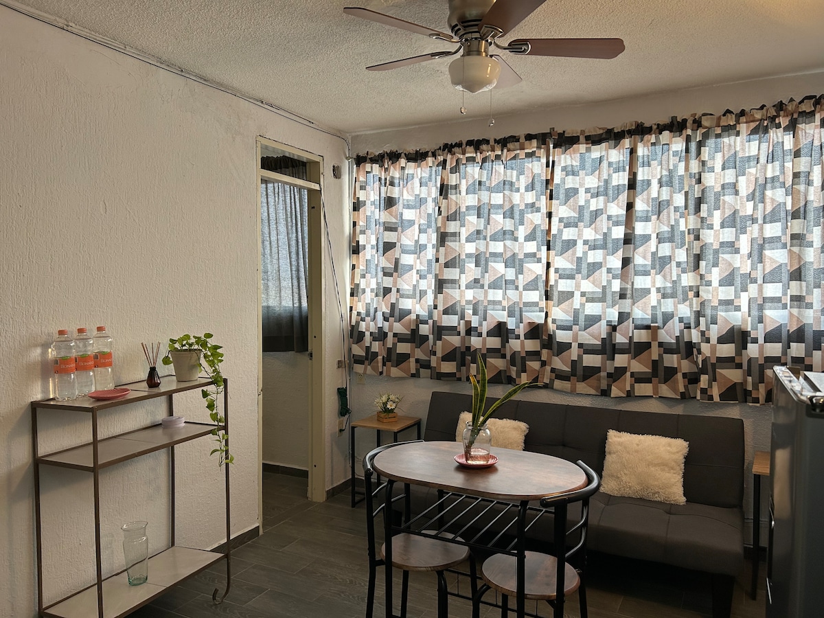 Excelente ubicación en zona residencial silenciosa para un excelente descanso. La sala comedor es muy amplia, lo que permite una buena y espaciosa convivencia. Pregunta por las estancias mensuales Es muy seguro con la puerta de garage corrediza a la banqueta y ya después la puerta del departamento; el depa que se ofrece está en el primer piso. Son 3 camas, una King y dos matrimoniales; la estancia de 6 personas presume que puedan dormir 2 en cada cama