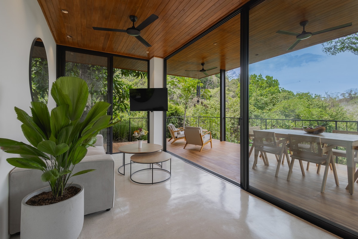 Villas Almendro is 1 of 4 villas at Villas Solar. 2 bedrooms, 1 with a queen and the other w/ 2 full sized beds, sleeps up to 6 comfy. Full kitchen, living room, bathroom, tv, ac, wifi, parking, balcony, and patio with hammock and great view. 3 min to surf! We have 2 internet service providers on the property with 200 mgs of wifi each, all routers backed up with batteries for potential outages, in case you need to work during your stay. We are pet friendly and offer laundry service for a fee