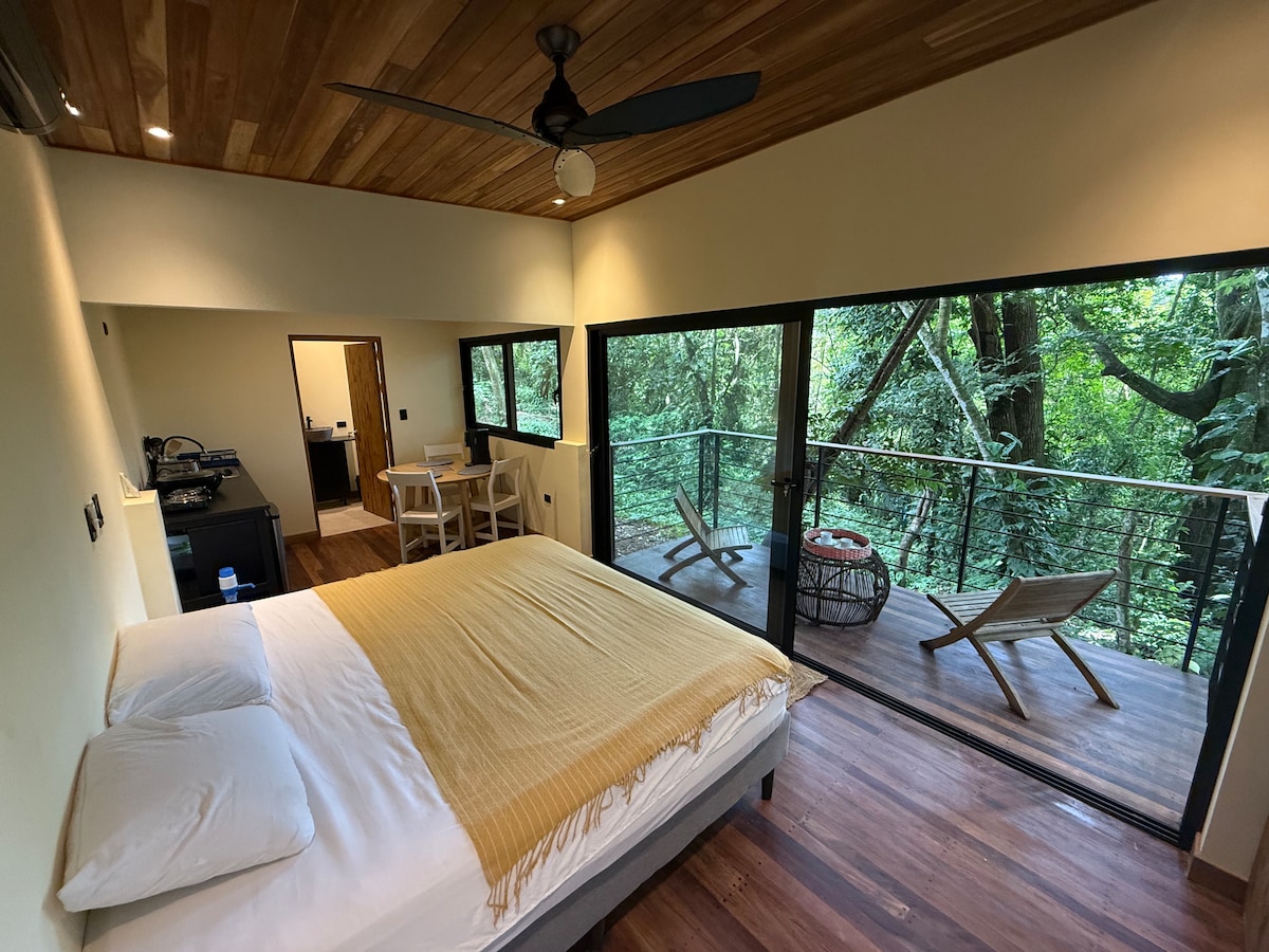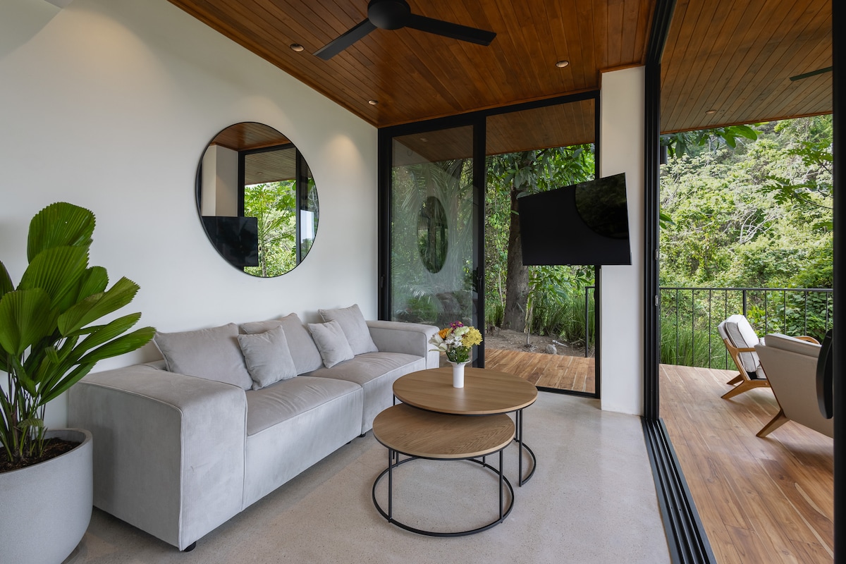Tropica Flats 3 Papagayo is a New modern design confortable concept. Located 10 min walk and 5 min drive from the beach and Santa Teresa's downtown beautiful areas, restaurants, coffee shops and supermarket, up the hill (vehicle recommended). One bedroom with AC and equipped kitchen (no AC in the kitchen, on the 2 floor. Enjoy a peaceful jungle mountain view, kick back and relax in this calm, stylish space. An excellent choice for those who are traveling in couples, remote workers and families.
