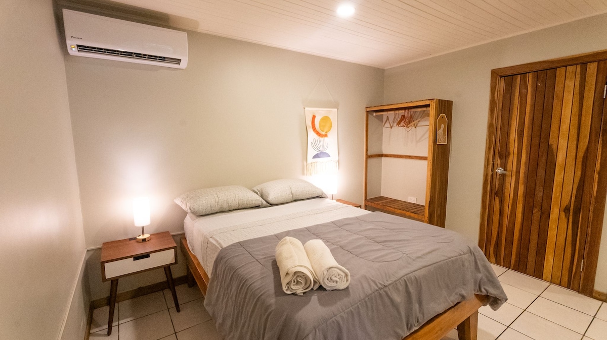 Our one br apartment is located just a block from the beach and main road, this cozy retreat is perfect for couples or solo travelers. The bedroom features a queen-sized bed, and the living area is spacious with an Smart Tv.hHas a well-equipped kitchen. The bathroom provides all essentials. Enjoy comfort with amenities like air conditioning, complimentary Wi-Fi, and beach essentials. Immerse yourself in the laid-back atmosphere of Santa Teresa and book your stay now for a tropical getaway!