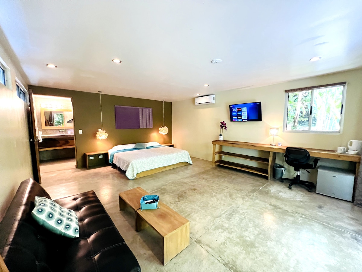 Este lugar tiene una ubicación fantástica rodeado de naturaleza. La habitación cuenta con una cama doble, ventilador, refrigerador, cafetera, agua caliente,WIFI y baño privado. Los huéspedes pueden usar la cocina compartida, el comedor y area de recepción. Importante: El aire acondicionado no está incluido en la tarifa y lo puede adquirir en la recepción adicional por $25 la noche. Esta tarifa es por un maximo de dos personas: cada infante, nino y/o mascota debe pagar como huesped adicional.