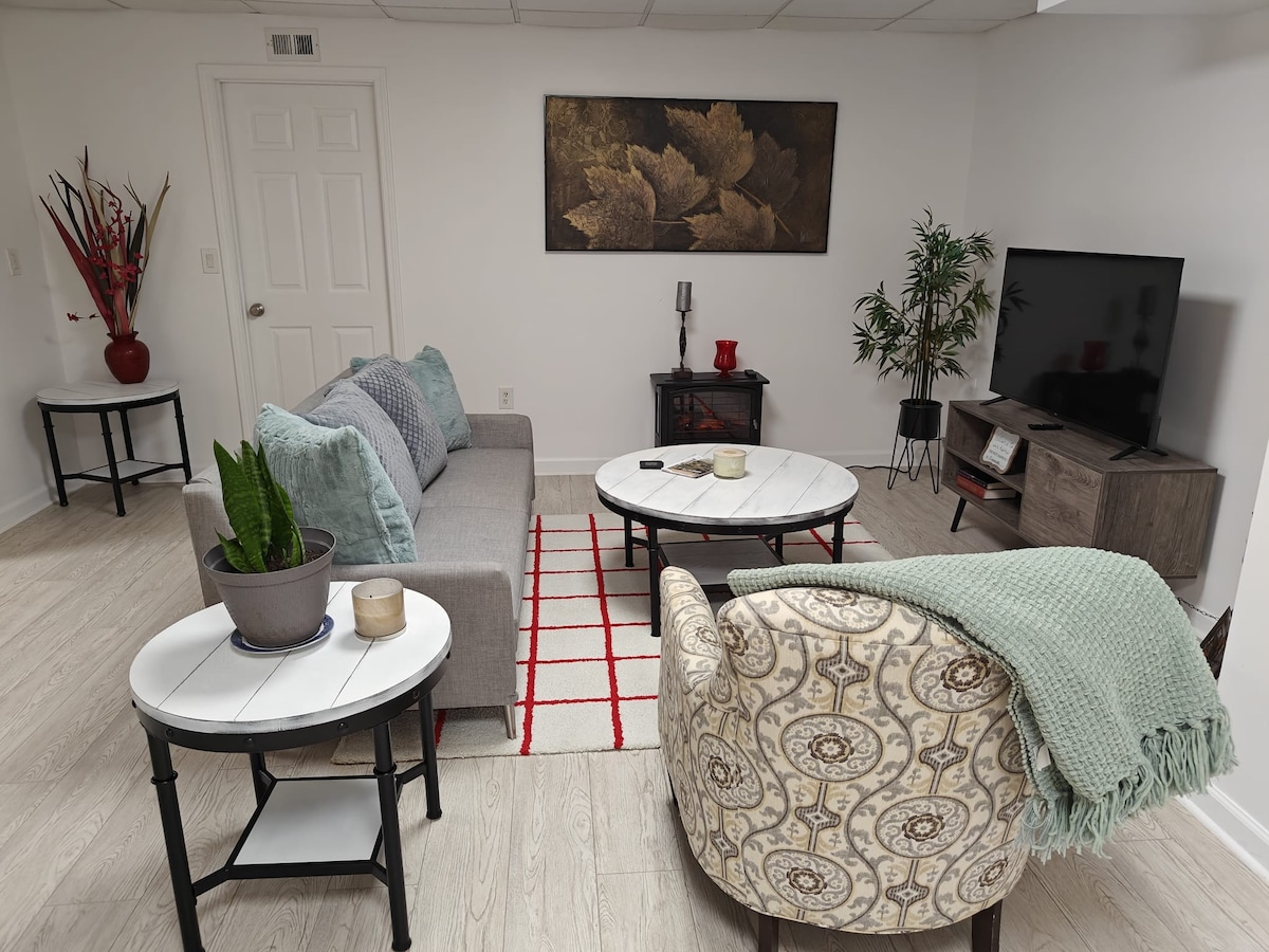 A beautifully renovated and spacious 1 bed/1 bath private basement apartment with a private, separate entrance! The apartment includes stainless steel kitchen appliances, wifi, a dedicated workspace, two flat screen Fire TVs, washer & dryer, and an electric fireplace. Located in a quiet residential neighborhood, but only 5 miles away from the historic Marietta Square and 5 miles away from the Braves Stadium. Enjoy the peace and quiet while still being close to the excitement of metro Atlanta!