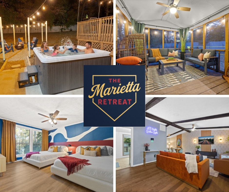 Wake up in a king suite with a soaking tub, spend sunny afternoons by the SEASONAL heated pool & end the night in the bubbling hot tub. This open, spacious 4BR villa near Truist Park blends luxury with the privacy of home. ★ Living room with 65" Smart TV ★ Chef's kitchen, skylights ★ Two king suites with spa baths, plus queen & bunk room ★ Wi-Fi, workspace & laundry ★ Two decks, outdoor dining & firepit ★ Pool & ping pong tables ★ Free parking for 5 cars ★ Just 15 min to The Battery Atlanta.