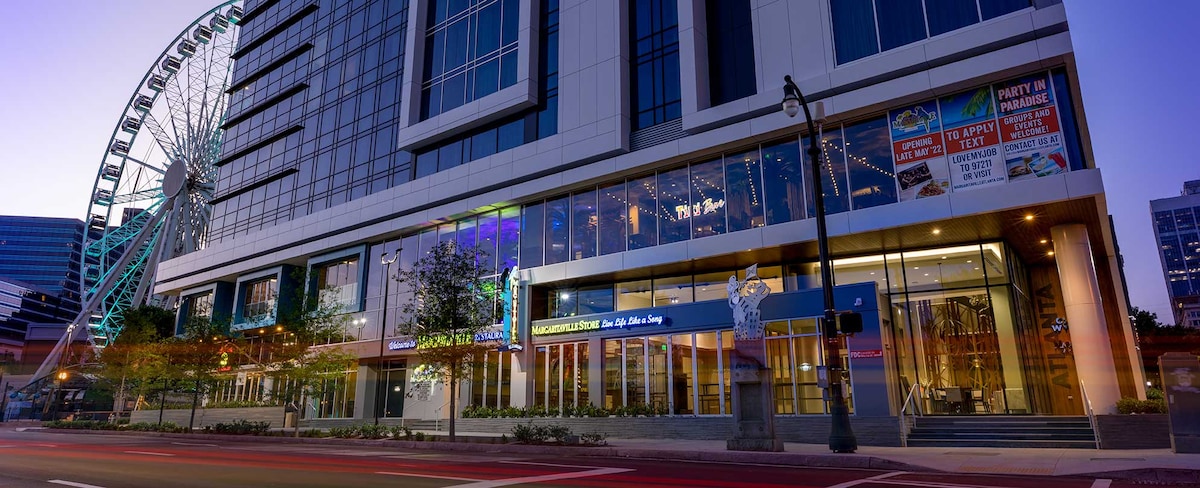 Experience Atlanta in style at this modern studio just steps from Mercedes-Benz Stadium, State Farm Arena, and Centennial Park! Located in the exclusive Wyndham Margaritaville tower, this chic space sleeps up to 4 with a plush king bed and queen sofa sleeper. Enjoy a kitchenette, a sleek bath, and resort-style perks—rooftop pool with skyline views, on-site dining, fitness center, and a rooftop bar perfect for sunset cocktails. Walk everywhere, relax in comfort, and make your ATL stay memorable!