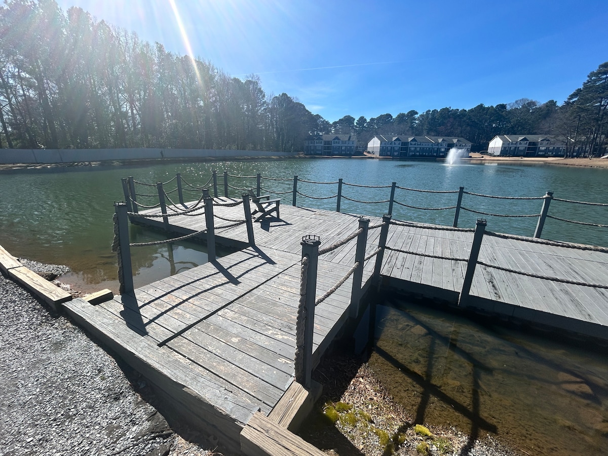 This Casual Executive apartment to stay is perfect for group trips, it is located by the Truist Park home of the Braves and a easy 5 min walk to the Coca Cola Roxy. During your stay, you will rest in a huge King size bed, the kitchen is fully equipped with everything you may need and safe dishes for the little ones. The spacious living room has a comfortable queen size sofa bed for additional guests, and a beautiful view of the lake.
