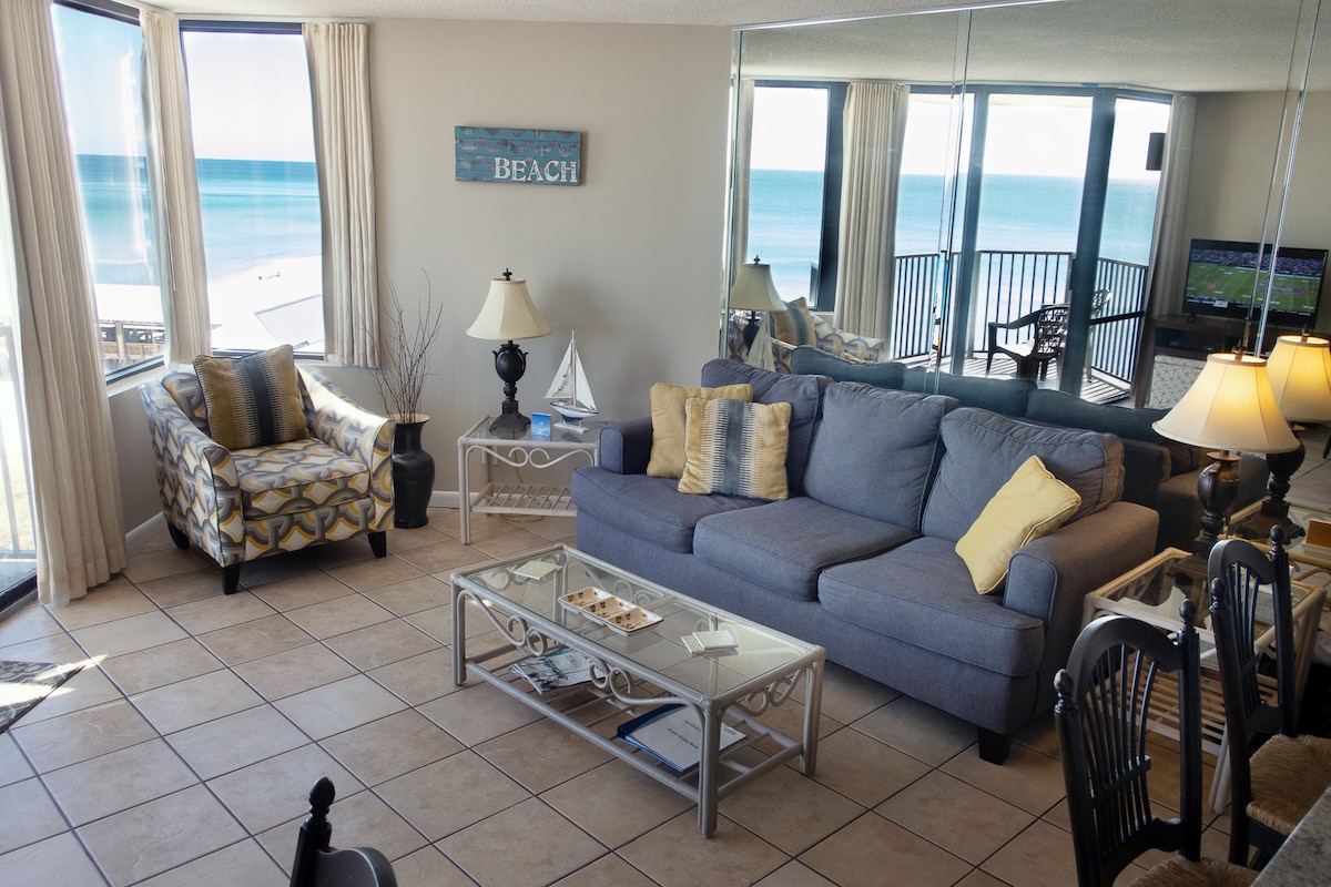 BEACH FRONT PENTHOUSE in mid-rise corner unit of beautiful Sunbird Beach Resort, featuring a gated community with secure parking and full beach chair and umbrella service included during spring and summer. Leave the world behind and let us transport you to your happy place! We are right on the beach where you can hear the waves and watch for playful dolphins right from your balcony! Brand new completely redone inside and out, including floor-to-ceiling windows and new balcony railings.