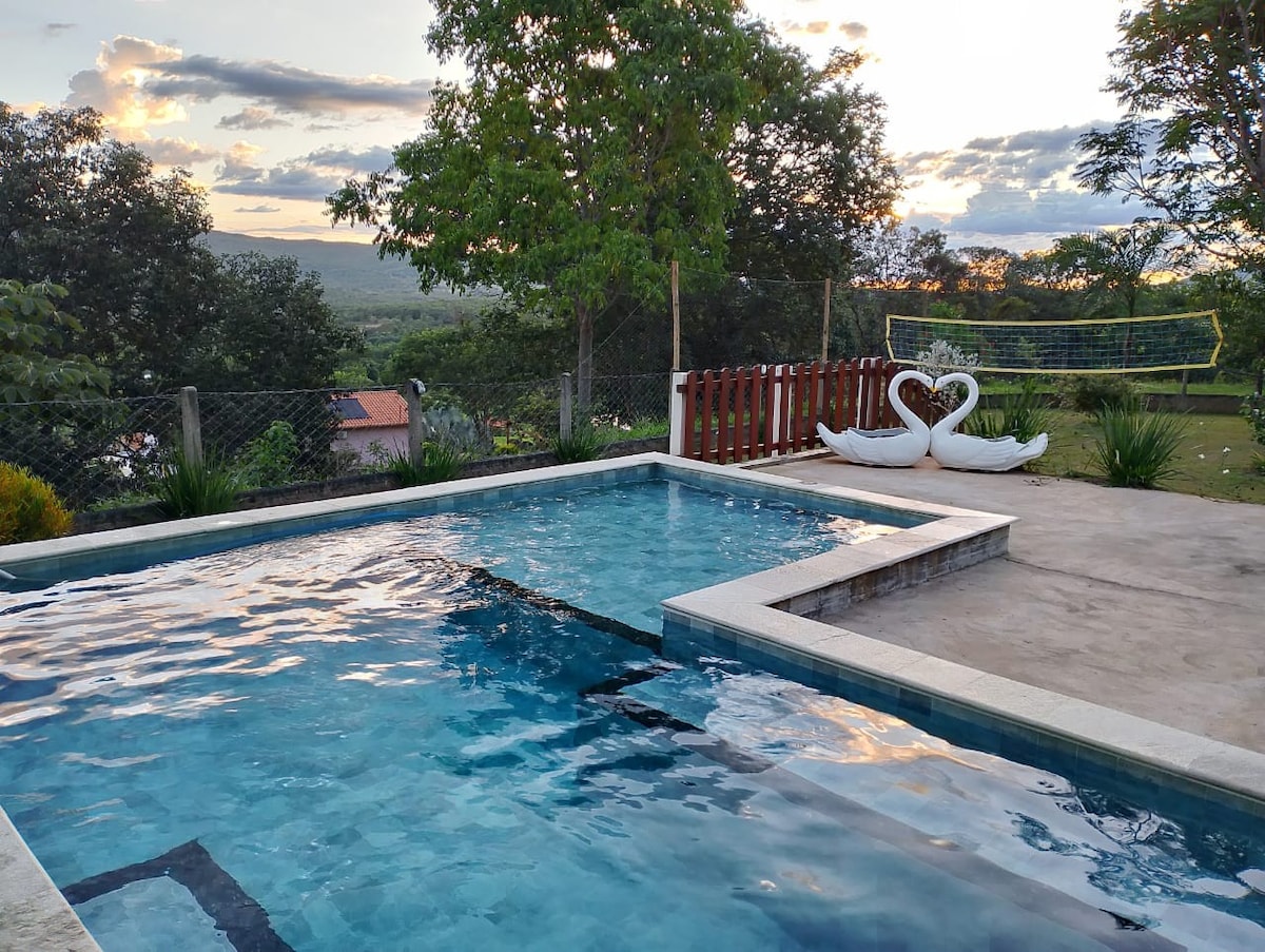 Com piscina aquecida, agradável, ampla e arejada, a apenas 1 km do centro e a 500m da saída para algumas das principais cachoeiras de Pirenópolis, a casa é perfeita para receber de forma confortável e acolhedora a todos os hóspedes. Com garagem coberta para até quatro carros e um jardim à frente, a casa é despojada, tornando-a prática para uma estadia sem preocupações. Obs: há camas disponíveis para 8 pessoas, mais o sofá de um lugar para dormir. Hóspedes adicionais devem levar seus colchões!