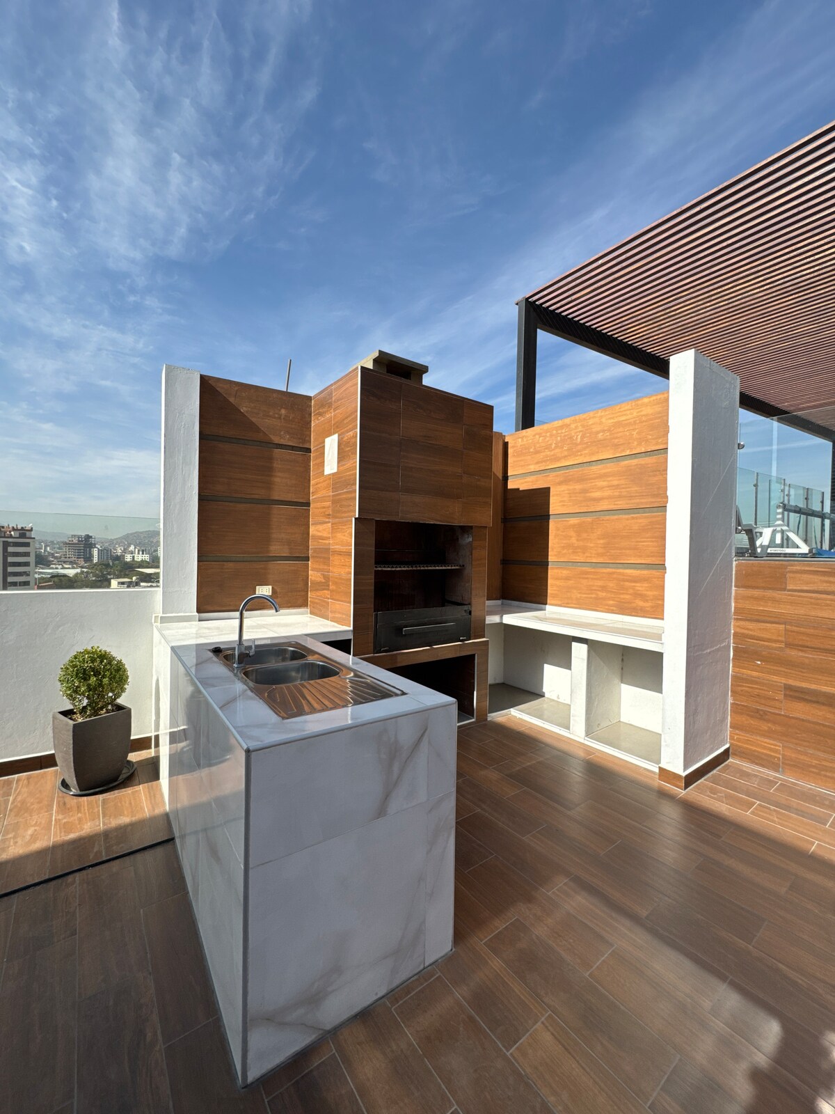 Exclusivo departamento de 1 habitación,ideal para parejas, viajeros de negocios o quienes buscan confort. Ubicado en una de las zonas más exclusivas y seguras de la ciudad, estarás a pasos de cafés, restaurantes, supermercados y centros comerciales Con habitación amplia con cama king. Cocina completamente equipada con refrigerador, microondas, cocina, lavadora Sala cómoda con sofá cama y Smart TV Piscina en la azotea con vista panorámica a la ciudad. Área de parrillero junto a la piscina70380815