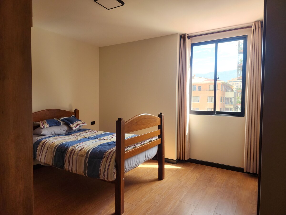 New and Modern Apartment on the Main Avenue of the Best Area in Cochabamba. ✨ In front of the Best Mall in Cochabamba, surrounded by restaurants, shops, supermarkets, and parks. ✨ It has 2 bedrooms with Queen-sized beds and a 2-person sofa bed. ✨ Equipped kitchen with refrigerator, microwave, and oven. ✨ Fiber Optic Wi-Fi, Smart TV, Alexa. ✨ Common areas (by prior consultation): Terrace with Pool and the best panoramic view, Gym, Grill.