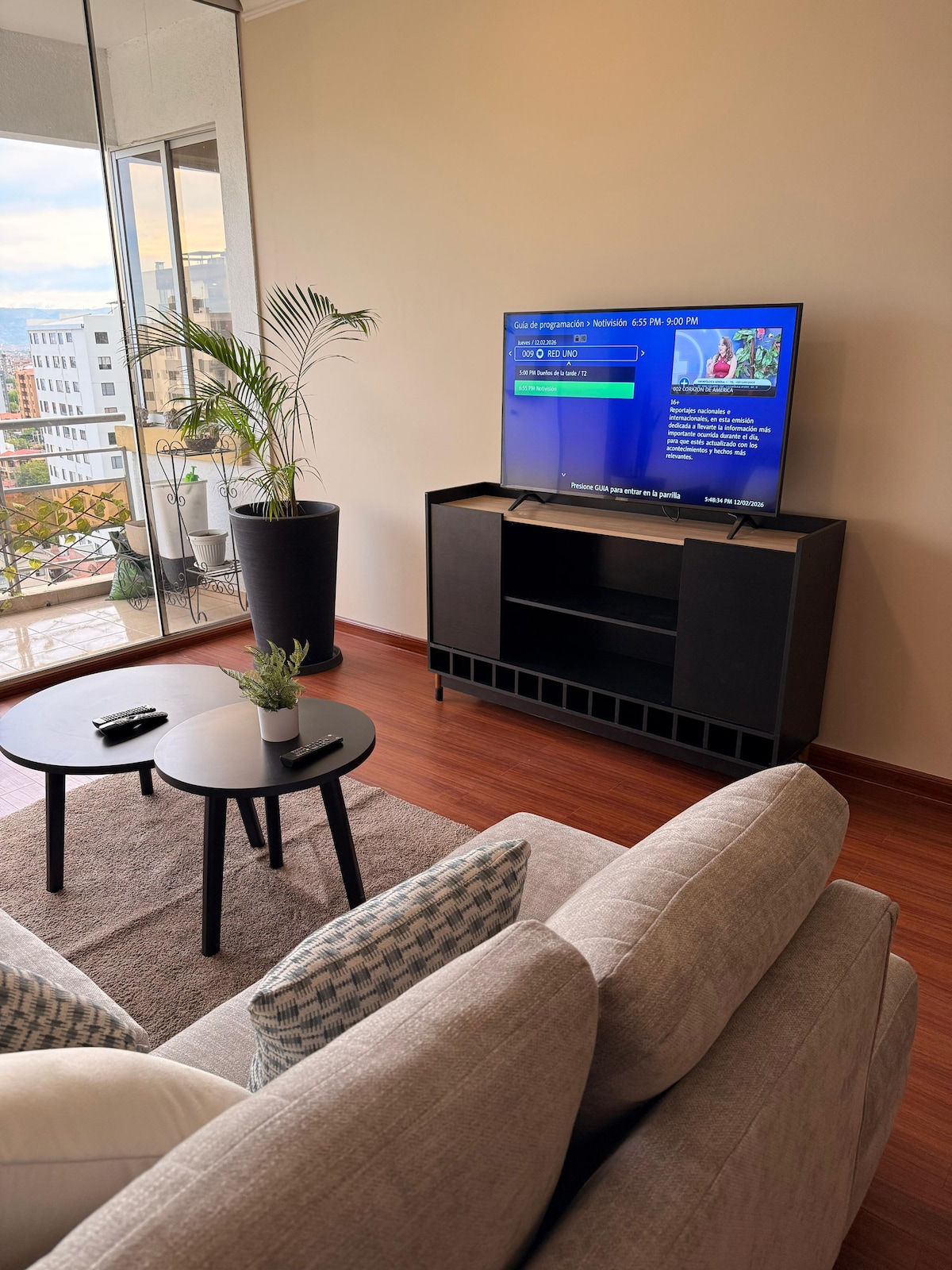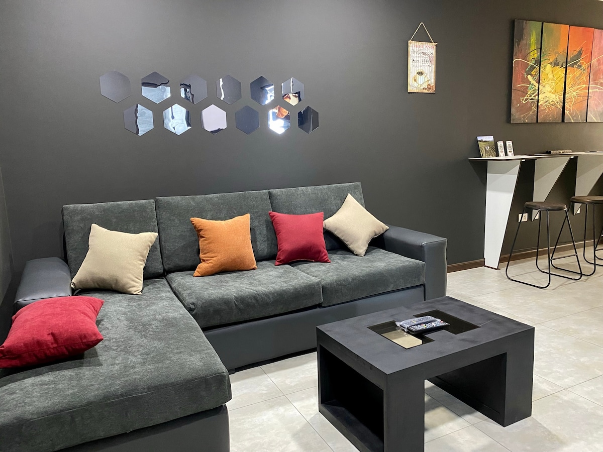 New and Modern Apartment on the Main Avenue of the Best Area in Cochabamba. ✨ In front of the Best Mall in Cochabamba, surrounded by restaurants, shops, supermarkets, and parks. ✨ It has 2 bedrooms with Queen-sized beds and a 2-person sofa bed. ✨ Equipped kitchen with refrigerator, microwave, and oven. ✨ Fiber Optic Wi-Fi, Smart TV, Alexa. ✨ Common areas (by prior consultation): Terrace with Pool and the best panoramic view, Gym, Grill.