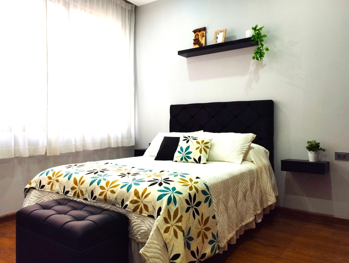 Enjoy a stylish experience at this centrally-located place. Our apartment is beautifully decorated with costume handmade furniture made in Bolivia. Located in the best area in Cochabamba surrounded by parks and a stunning view of the mountains and the Cristo. Walking distances to coffee shop, wellness yoga center, saturday local fresh markets, restaurants, public transportation, university, and so much more.