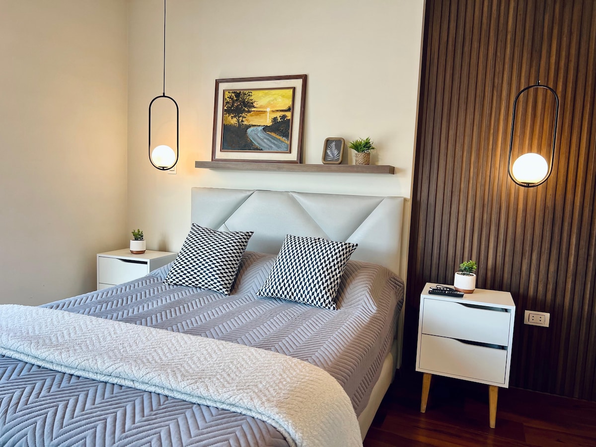 Siente el placer de descansar con una hermosa vista desde el 11 avo piso al icono de Cochabamba (Cristo de la Concordia) en nuestro dormitorio desde una cama King size ( 3 plazas) y sentir la brisa fresca por los grandes ventanales. Renueva energía en el encanto de este maravilloso departamento en la zona más exclusiva de la ciudad, que además de ser nuevo, cada detalle ha sido pensado en brindarte paz y armonía en tu estadía.