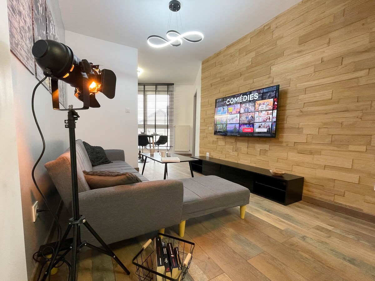 Chic & Cosy – Idéalement situé. Charmant appartement rénové, alliant confort et élégance. Situé à 200m du centre-ville, il offre un accès rapide aux commerces et aux axes autoroutiers tout en étant dans un quartier calme. Entrée de plain-pied, parking privé, climatisation, cuisine équipée et lit double pour 2 personnes. Que vous soyez en voyage d'affaires, en escapade romantique ou en simple halte, ce petit havre de paix saura vous séduire par son ambiance chaleureuse et son emplacement idéal