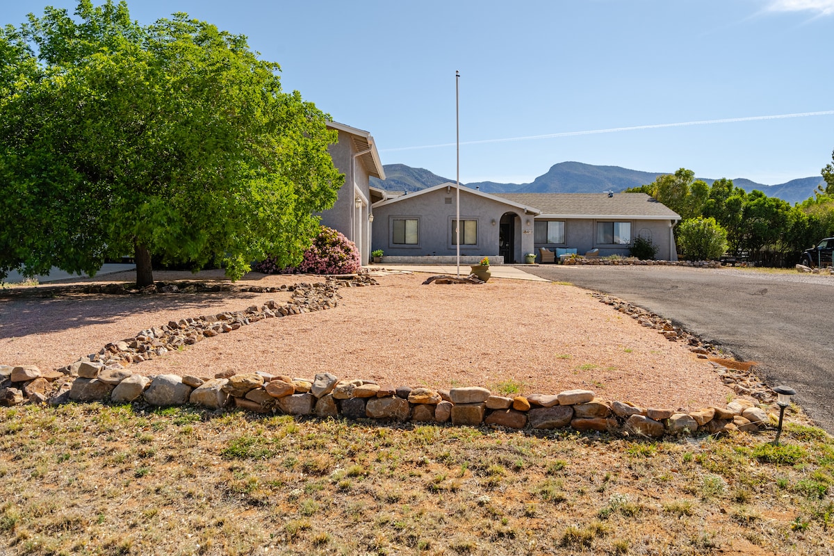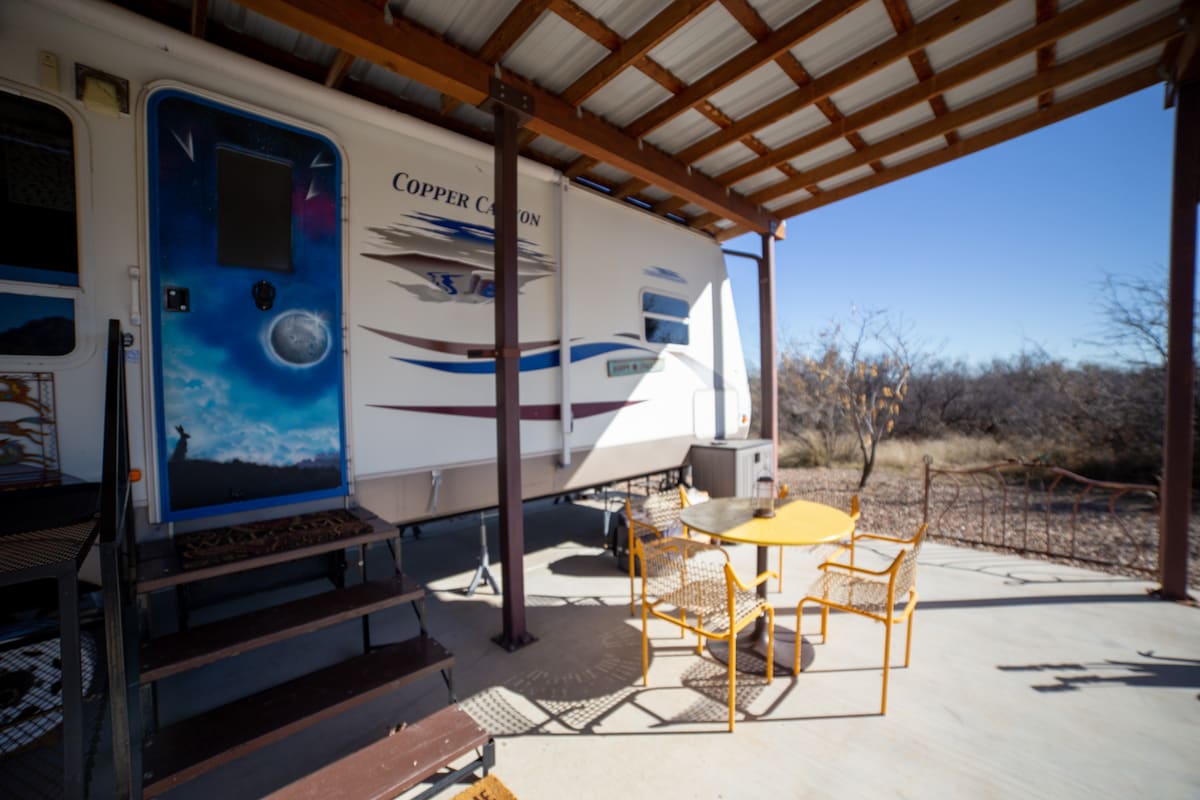 A spacious get-away nestled amidst desert trees in view of the breath taking Dragoon Mountain range. Living room, kitchen, dining room, bathroom and bedroom spaces. 12 foot by 32 foot roofed patio allows for indoor/outdoor living. The only sounds you are likely to hear are those of the coyote and other desert friends. There is a telescope available to view the amazing night skies. We also have a ground set fire pit for roasting marshmallows and enjoying the mountains at night.