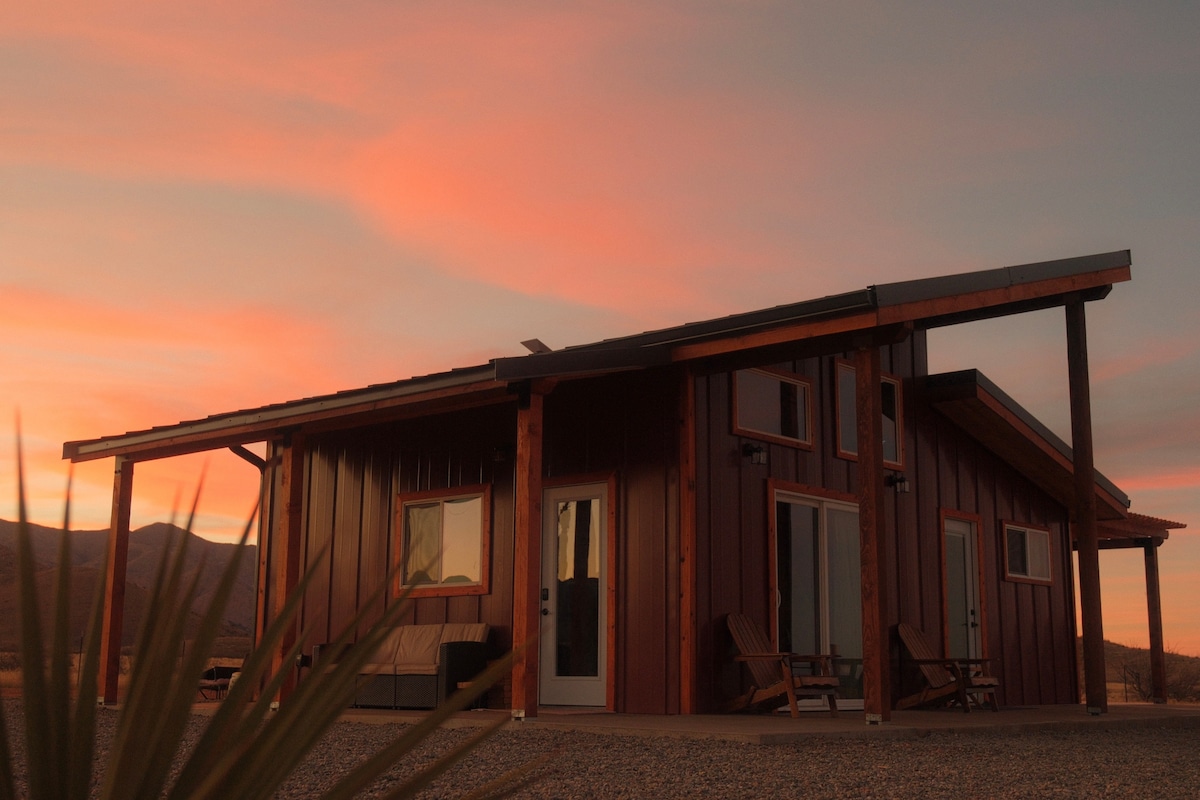 Nestled at the base of Cochise Stronghold in the Dragoon Mountains, this private getaway offers sweeping views and unforgettable sunsets. This custom cabin was hand crafted with comfort and aesthetics in mind. Large windows frame the epic sky island ranges all round. Blazing fast WiFi, full laundry, kitchen and bath, with dual zone climate control for max comfort. Explore rugged mountains, rich history, wineries, and wildlife by day. Soak in the private hot tub under stars by night.