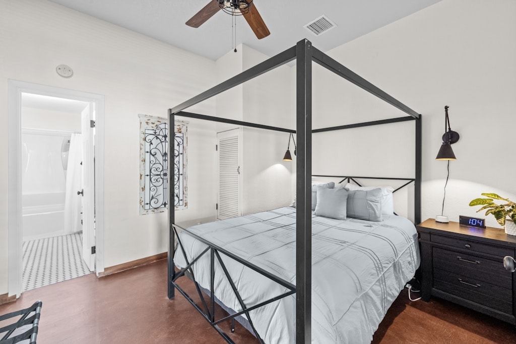 Stay in the center of the action in this one-of-a-kind place. can accommodate a family of 6 with 1 1/2 baths and two A/Cs. It has a loft and a deck offering breathtaking views of Old Bisbee. The suite features two pillow-top beds, one king and one queen, queen in the loft. The unit is illuminated by four skylights and cooled by a ceiling fan and two A/Cs.