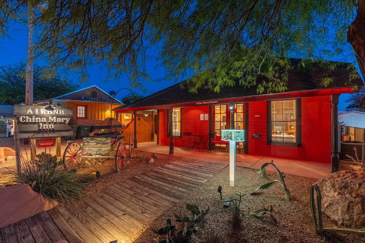 China Mary Casita: one bedroom (queen bed) & attached private bath. The room faces a beautiful fountain courtyard w/golf, axe throwing & BBQ. Relax & enjoy live music from nearby Saloon. Stay in the center of the action in Tombstone. The property is situated along all of the exciting happenings of Allen Street & just steps away from the World-Famous OK Corral. The China Mary is one of the most historical & interesting properties in Tombstone. Up to 4 suites available for larger groups.