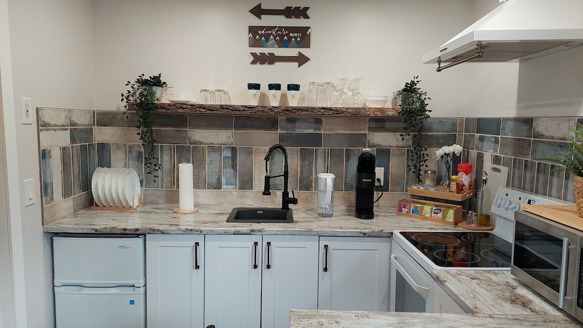 Discover your perfect getaway at Sunset Suite in Cochrane! Our charming retreat offers all the comforts you need, from a self-serve breakfast to a relaxing air-jet soaker tub. Enjoy the convenience of keyless entry, a well-stocked kitchenette, and in-suite laundry. Plus, our dog-friendly space ($35 pet fee) is just minutes from stunning mountain views and the iconic Cochrane RancheHouse. Accommodates up to 4 people with a queen bed and full sofa bed ($10 each for 3rd and 4th persons).