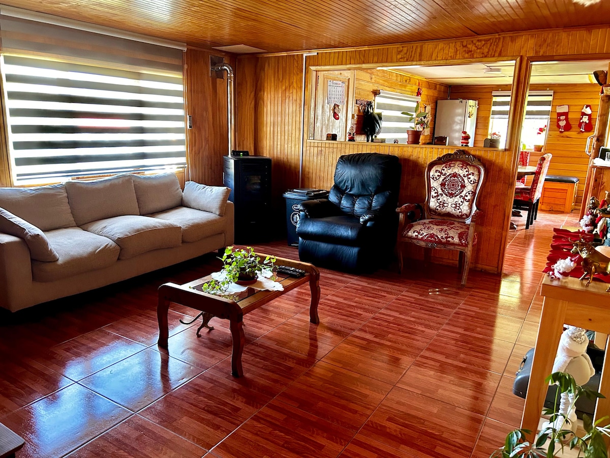 Hermosa cabaña rústica para desconectarte en la Patagonia. Con hermosa vista al cordón Esmeralda. Cuenta con una habitación matrimonial, una habitación doble, baño, cocina, living comedor y un patio amplio con estacionamiento incluído. Ven a disfrutar de este ambiente tranquilo y acogedor.