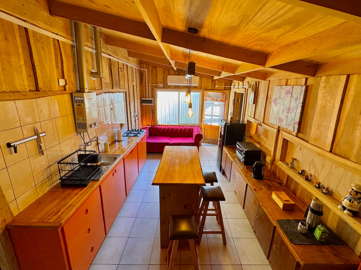 Este espacio unificado tiene todo en un solo ambiente, sus camas son cómodas, todo sus elementos están hechos de madera nativa y su caja para dejar zapatos es de madera con piedra ágata de la Playa de Puerto Guadal. Su cuarto de baño es privado, la cocina está completamente equipada con frigobar y es parte del espacio.