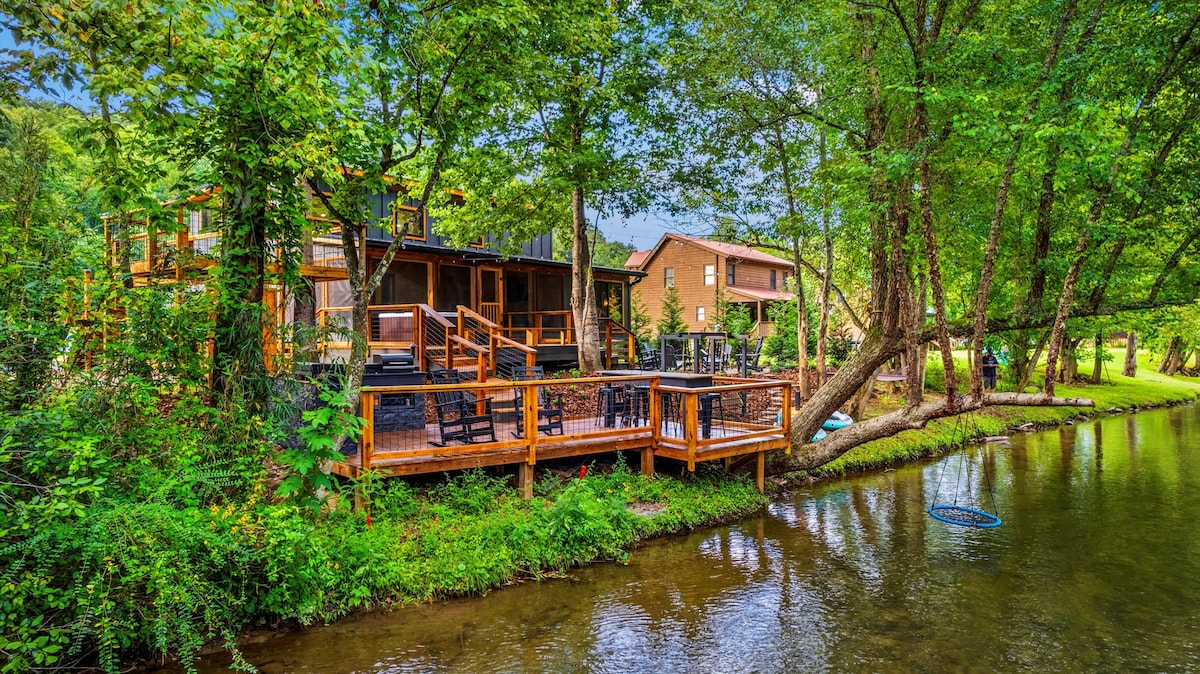 Luxurious, waterfront, mountain retreat, under a beautiful forest canopy. 8 ft wide glass door opens to the screened patio, with NEW hot tub! The roar of the rushing stream is heard throughout the cabin. Enjoy family bonding, or a romantic game night on the waterfront pavillion. 3 Level treetop deck, with telescope and darts! Relax by the campfire, Firewood included Easy access to cabin entrance in any vehicle. 20 min to Gburg! 2BR 2.5BA, Sleeps 5