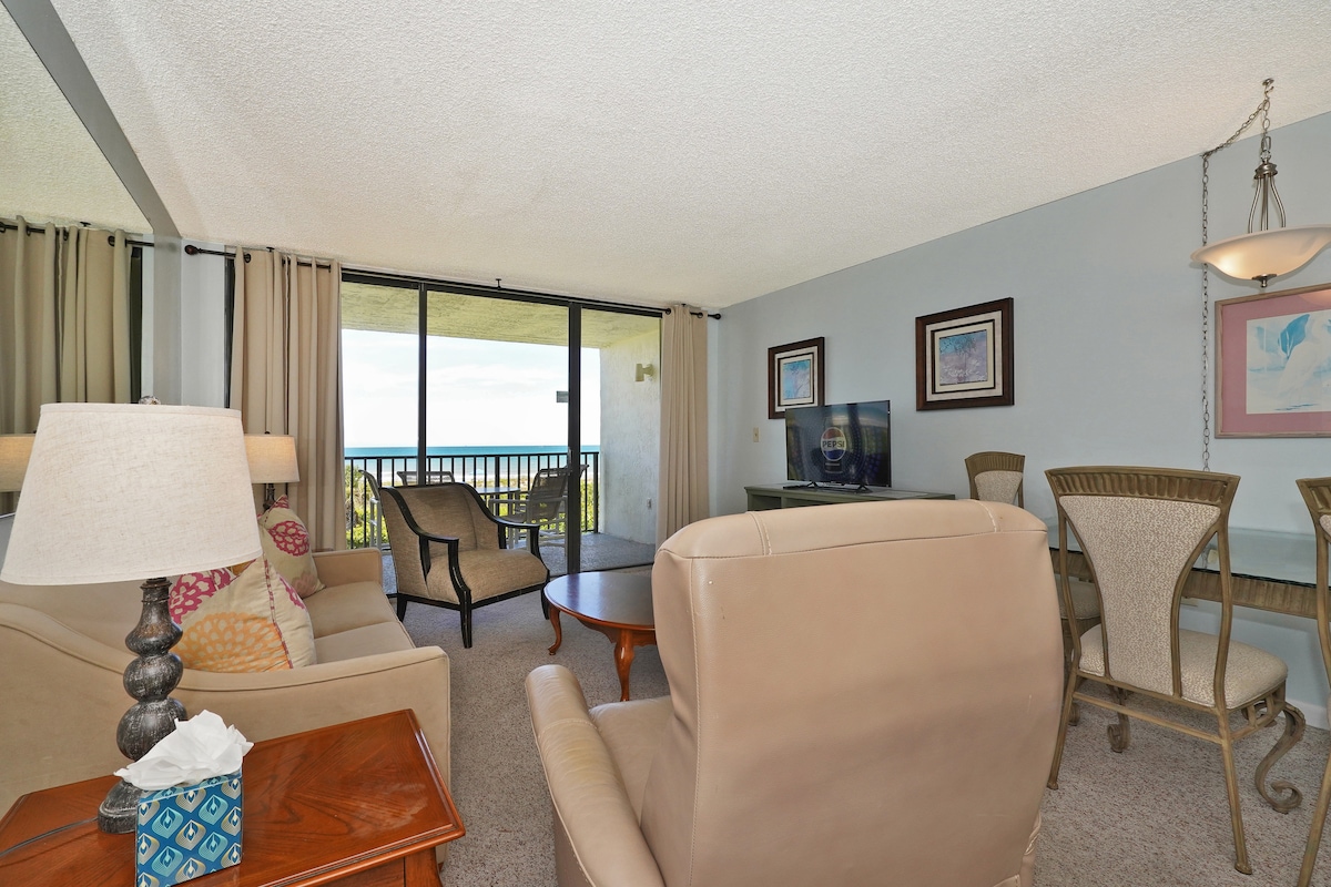 Savor Panoramic Ocean Views from the private balcony of this Beachfront second-floor condo. * Private beach access from backyard * Oceanfront balcony with comfortable seating * Convenient downtown Cocoa Beach location * Bedroom with King bed * Full kitchen with stainless steel appliances * 2 Smart TVs with cable * Free WiFi * Free assigned parking space * Full bathroom * In-unit washer and dryer * Full-sized foldout couch * Beach gear and towels * Complimentary toiletries, coffee and tea