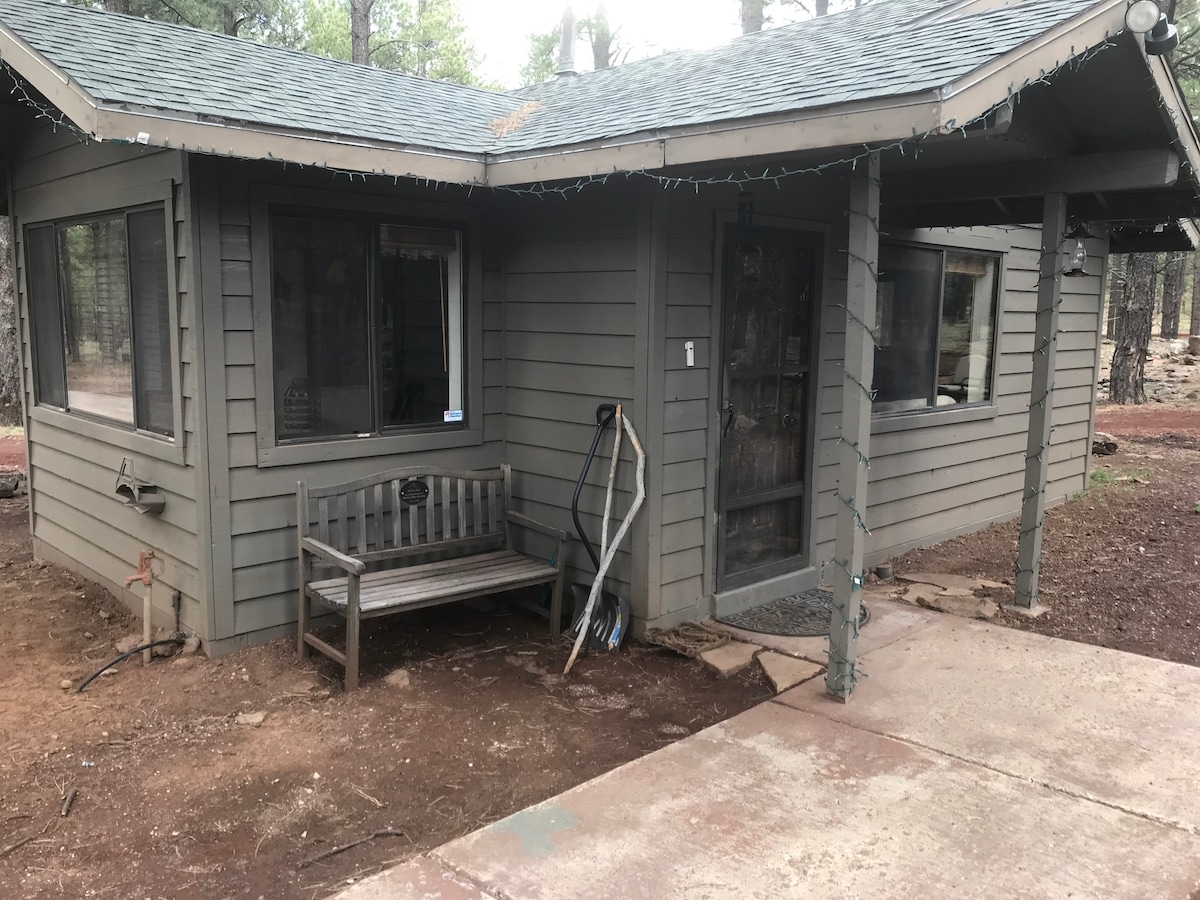 Flagstaff favorite. Beautiful cottage on a 1/2 acre yard, which sits across (fenced separately) from our personal residence. Features a full kitchen, cozy pellet stove and private outside deck. 10 min from historic downtown and Rt. 66. 15 min to Walnut Cyn, Sunset Crater, Wupatki National Parks. 45 min to Oak Creek Cyn/Sedona and 70 min to Grand Canyon. 40 min from Snow Bowl. The mountain view is stunning. Dark night skies perfect for star gazing. A honeymoon favorite. Friendly neighborhood.